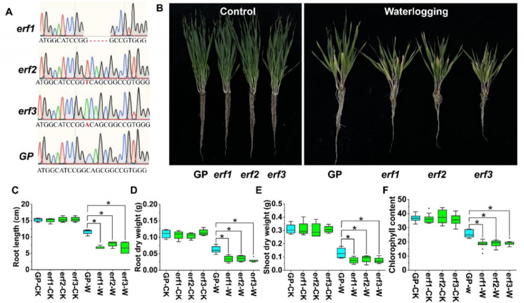 利用CRISPR/Cas9基因編輯技術(shù),獲得了3個獨立的 HvERF62 純合突變體(erf1、erf2、erf3)。這些突變體在正常條件下與野生型(GP)的生長發(fā)育沒有顯著差異。然而,在漬澇脅迫下,突變體的不定根數(shù)量顯著少于野生型,且根長、地上部干重、根干重和葉綠素含量均顯著低于野生型(圖4B-4F)。