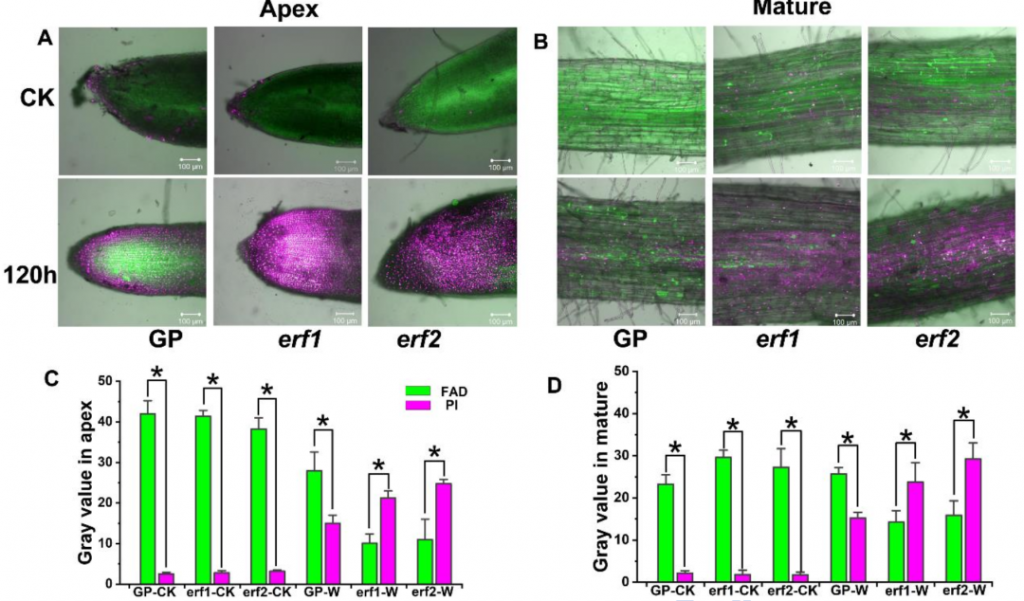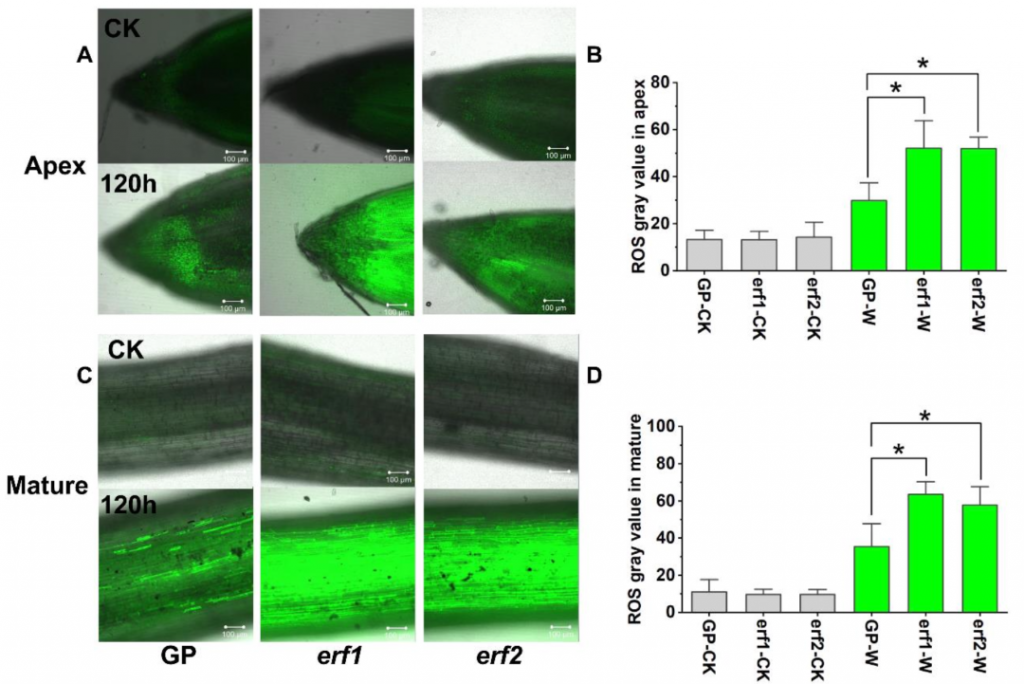 細(xì)胞活力染色實驗表明,在漬澇脅迫下,HvERF62 突變體根部的細(xì)胞死亡程度高于野生型(圖8)。ROS熒光染色實驗表明,在漬澇脅迫下,突變體根部積累了更多的ROS(圖9)。此外,突變體中H2O2含量顯著高于野生型,而CAT和GSH活性顯著低于野生型(圖7A-7C)。