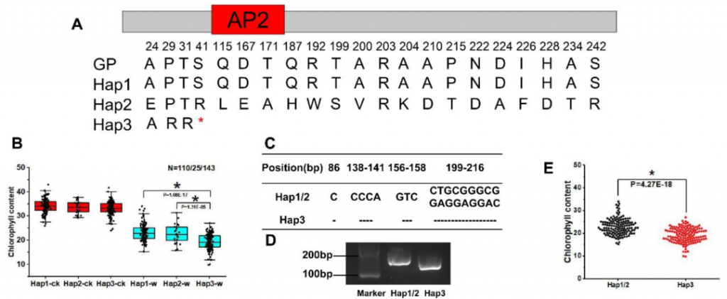 對自然群體中 HvERF62 基因的序列進(jìn)行分析,發(fā)現(xiàn)存在43個SNPs和4個InDels。根據(jù)這些變異,將種質(zhì)資源分為3個單倍型(Hap1、Hap2和Hap3)。其中,Hap3由于序列變異導(dǎo)致編碼提前終止。在漬澇脅迫下,Hap1和Hap2的葉綠素含量顯著高于Hap3(圖10A, 10B)?;贗nDel變異設(shè)計的分子標(biāo)記可用于區(qū)分不同單倍型(圖10C-10E)。