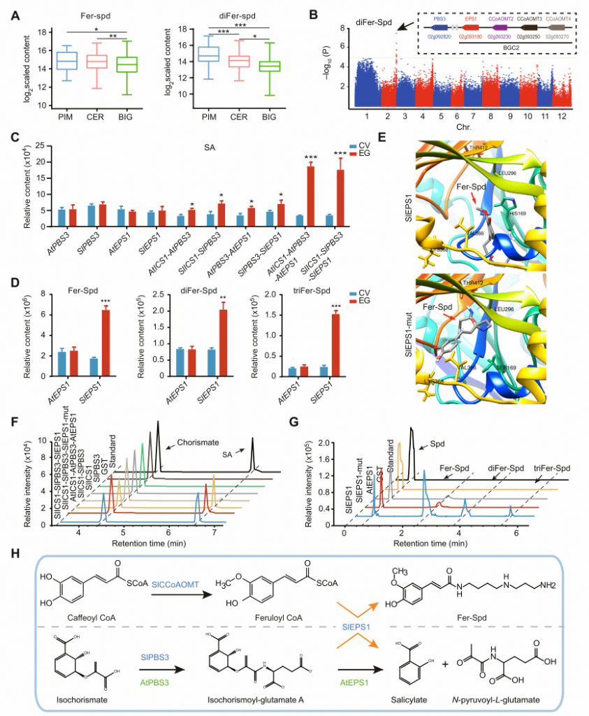 該研究對401份番茄群體材料的酚胺物質(zhì)進(jìn)行了檢測,通過基于代謝物全基因組關(guān)聯(lián)分析(GWAS)鑒定出2號染色體上與酚胺合成基因簇(BGC2)。實(shí)驗(yàn)證明基因簇中核心組分SlEPS1參與水楊酸和酚胺的生物合成,其關(guān)鍵氨基酸殘基 His169對酚胺合成至關(guān)重要,且SlEPS1的雙酶活性與增強(qiáng)的抗病性相關(guān)(圖1)