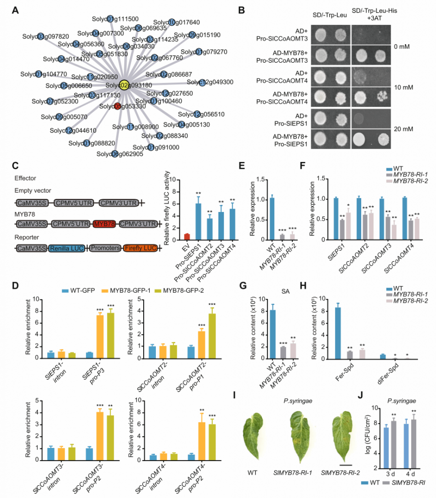 此外,研究還發(fā)現(xiàn)了一個與BGC2顯著共表達(dá)的轉(zhuǎn)錄因子SlMYB78。它能夠直接結(jié)合并激活BGC2基因簇的啟動子,從而調(diào)控BGC2基因簇的表達(dá)。當(dāng)SlMYB78基因被沉默時,酚胺和水楊酸的含量顯著下降,導(dǎo)致其抗病能力降低(圖3)。