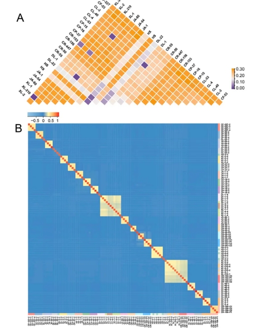 通過(guò)計(jì)算品種兩兩之間的Fst值與構(gòu)建遺傳距離矩陣,研究進(jìn)一步明確了油茶品種間的遺傳分化程度和親緣關(guān)系(Figure 5)。Fst值的分析結(jié)果顯示,長(zhǎng)林CL-4、達(dá)林DL-1與湘林XL-1三者之間的Fst值極低(0.0106–0.0110),這表明這些品種可能源自相同或相似的遺傳背景。類(lèi)似地,川榮CR-153與湘林XL-3、湘林XL-210之間的Fst值也表現(xiàn)出較高的遺傳相似性(0.0036–0.0442),提示這些品種可能具有共同的祖源關(guān)系。相比之下,達(dá)林DL-22與川榮CR-50(0.0816)、川榮CR-55(0.0870)和達(dá)林DL-1(0.0759)之間的Fst值較高,顯示出較為顯著的遺傳分化,反映其與這些品種的親緣關(guān)系較為緊密,但仍保持一定的遺傳獨(dú)特性。其它品種的Fst值范圍從0.1013到0.2908,表明這些品種的遺傳起源更加多樣,可能涉及不同的地理區(qū)域或品種間的較大差異(Figure 5A)。研究人員進(jìn)一步使用GCTA軟件計(jì)算的G矩陣分析,結(jié)果顯示大多數(shù)油茶品種之間的親緣關(guān)系較為明顯,遺傳分化較大(Figure 5B)。然而,一些品種群體的親緣關(guān)系值相似,例如XL-1、CL-4與DL-1;CR-153、XL-3與XL-210;華碩HS與華鑫HX,表明這些品種可能源自相同或相近的祖先背景。與此不同,達(dá)林DL-22品種在其群體內(nèi)部未顯示出顯著的親緣關(guān)系,反映出其群體內(nèi)存在較高的遺傳分化??傮w而言,這些分析為理解油茶品種的遺傳背景和親緣結(jié)構(gòu)提供了重要依據(jù),揭示了不同品種之間的親緣關(guān)系及其遺傳多樣性。