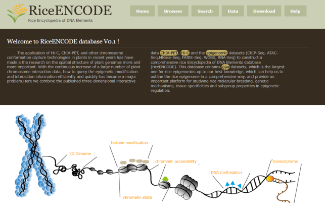 ☆?水稻多元表觀基因組數(shù)據(jù)的數(shù)據(jù)庫RiceENCODE:該數(shù)據(jù)庫收集了包括ChIP-seq,ATAC-seq, MNase-seq, FAIRE-seq, BS-seq, RNA-seq, ncRNA-seq, Hi-C和ChIA-PET?等水稻高通量數(shù)據(jù),可查詢不同品種、不同組織、不同染色體區(qū)段交互信息,兩兩基因之間交互網(wǎng)絡等。