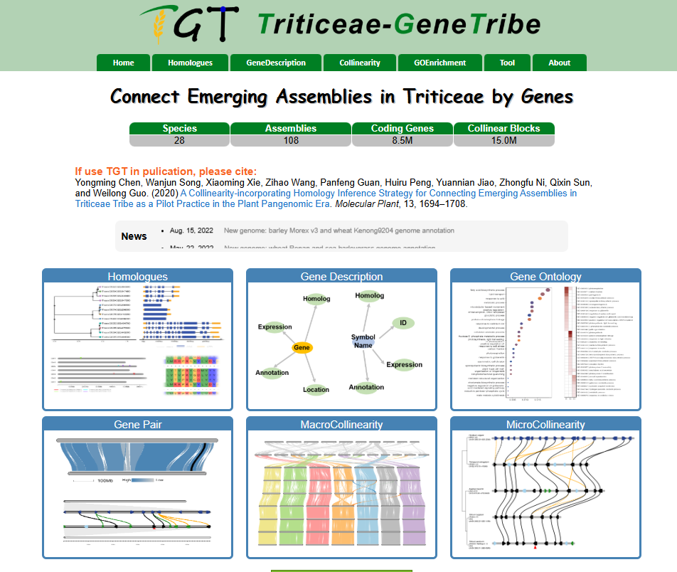 ☆?小麥族同源基因數(shù)據(jù)庫TriticeaeGeneTribe:利用小麥族物種中已發(fā)表的基因組,對不同參考基因組間同源基因鑒定,構建了小麥族同源基因數(shù)據(jù)庫。同時,數(shù)據(jù)庫具有基因功能查詢,GO富集分析,同源基因查詢,基因組區(qū)間共線性分析等功能。