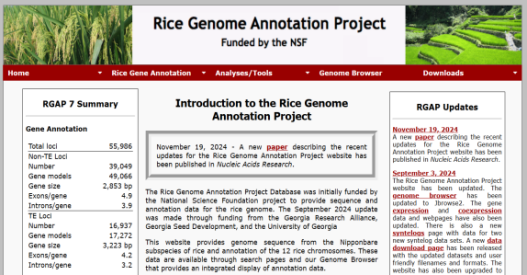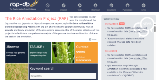 ☆?水稻基因組注釋項目數(shù)據(jù)庫RGAP與水稻注釋計劃RAP:旨在提供水稻日本晴基因組的序列和注釋數(shù)據(jù)。該網(wǎng)站提供基因組序列和12條水稻染色體的注釋,基因的分布,或者根據(jù)基因名稱查找基因的功能和序列、下載數(shù)據(jù)或使用blast搜索同源基因。