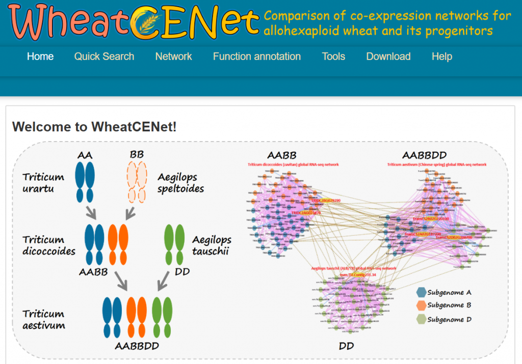 ☆?異源六倍體小麥及其祖先的比較共表達網(wǎng)絡分析數(shù)據(jù)庫WheatCENet:集成了功能注釋,蛋白質-蛋白質相互作用、miRNAs,GO注釋、GSEA等工具能夠搜索和比較特定的功能共表達網(wǎng)絡,識別其中聚集的基因的相關功能。