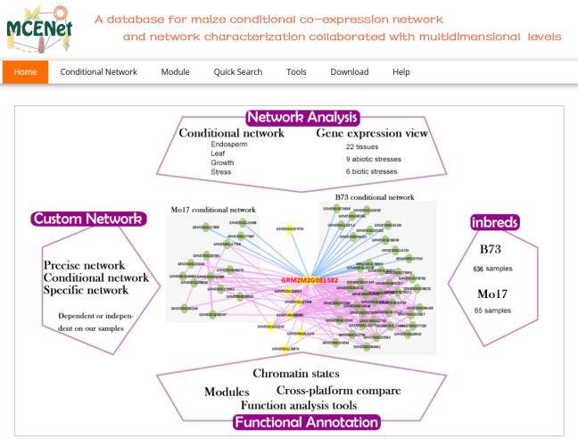 ☆?玉米多組學基因網(wǎng)絡分析平臺:整合了701個轉錄組學數(shù)據(jù)和108個表觀基因組數(shù)據(jù),并研究了具有多維組學水平的不同條件網(wǎng)絡。MCENet?還提供?5?個網(wǎng)絡訪問分析工具包(即?Network Search、Network Remodel、Module Finder、Network Comparison?和?Dynamic Expression View)和多個網(wǎng)絡功能支持工具包。