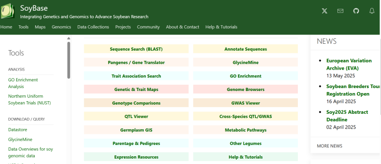 ☆?大豆基因組學和分子生物學數(shù)據(jù)庫:為大豆研究者提供了大量的數(shù)據(jù)和工具,以支持大豆的遺傳學、基因組學和育種研究。用戶可以通過SoyBase查找大豆的基因組信息、遺傳資源、表型數(shù)據(jù)等,并利用其中的分析工具進行數(shù)據(jù)挖掘和可視化。