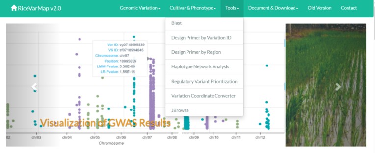 ☆?水稻基因組變異及其功能注釋的綜合數(shù)據(jù)庫RiceVarMap v2.0:提供了來自4,726個水稻種質的測序數(shù)據(jù)中的17,397,026個基因組變異(包括14,541,446個SNP和2,855,580個小?INDEL)的精選信息,高質量和完整的基因型數(shù)據(jù),變異的全面注釋,表型數(shù)據(jù)和?GWAS?結果,對功能基因定位,標記開發(fā)的客戶非常友好。