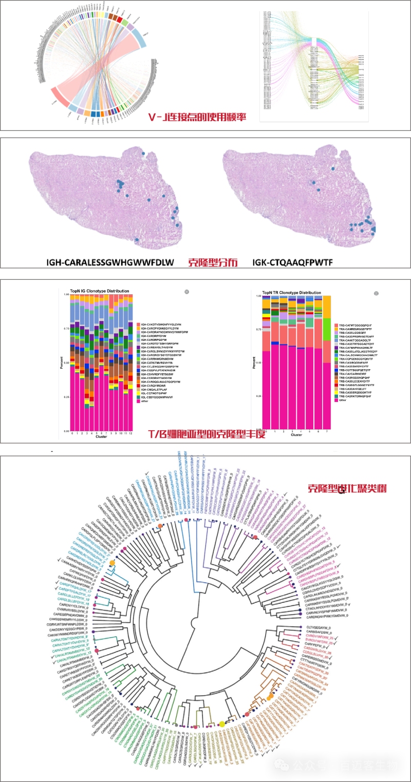 腫瘤樣本我們可以類比為一處具有復雜地貌的特殊地理環(huán)境,不同的環(huán)境造就了各種細胞的不同狀態(tài),而T/B細胞在不同的“選擇壓力”下邊進行了不同的“適應性進化”。對不同生態(tài)位的T/B細胞尤其是TCR/BCR進行測定,有助于我們?nèi)ソ沂久庖呒毎目寺∑鹪春瓦M化過程。例如,通過分析TCR的VDJ重排,可以追蹤T細胞克隆的起源和擴增過程。這種分析有助于理解免疫細胞在不同生理和病理狀態(tài)下的動態(tài)變化。
