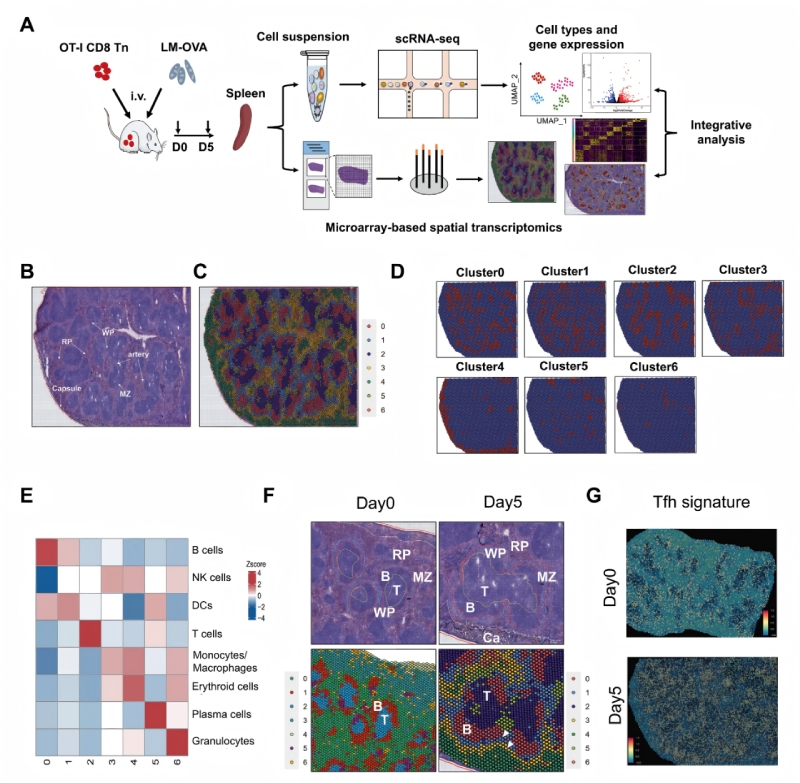 為了研究免疫反應(yīng)過程中不同免疫細(xì)胞的空間分布和CD8+?T細(xì)胞分化的調(diào)節(jié)機(jī)制,研究人員通過整合單細(xì)胞RNA測(cè)序(scRNA-seq)和BMKMANU?S1000空間轉(zhuǎn)錄組(ST)技術(shù),分析了急性感染模型中脾臟免疫細(xì)胞的空間分布與CD8??T細(xì)胞分化機(jī)制。實(shí)驗(yàn)采用OT-I轉(zhuǎn)基因小鼠模型,通過李斯特菌(LM-OVA)感染誘導(dǎo)免疫反應(yīng),關(guān)鍵發(fā)現(xiàn)包括:1)脾臟形成7個(gè)功能集群(B細(xì)胞、T細(xì)胞、單核/巨噬細(xì)胞等);2)感染后T/B細(xì)胞區(qū)擴(kuò)大,APCs(B細(xì)胞、DC、巨噬細(xì)胞)在T細(xì)胞區(qū)外圍聚集;3)空間重組與T細(xì)胞分化(MP/TE亞群)顯著相關(guān)。多組學(xué)整合揭示了免疫微環(huán)境的動(dòng)態(tài)調(diào)控機(jī)制,為理解感染中細(xì)胞互作提供了多組學(xué)視角。