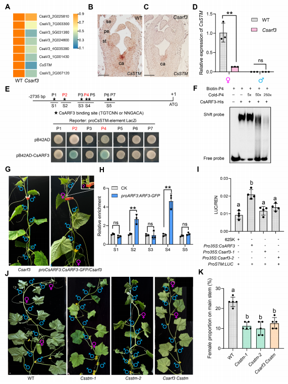 KNOX家族轉(zhuǎn)錄因子參與莖端分生組織(SAM)形成和心皮發(fā)育。研究發(fā)現(xiàn),Csarf3突變體異常心皮中多數(shù)KNOX?I類成員表達(dá)下調(diào),其中CsSTM(SHOOT?MERISTEMLESS同源基因)下降最為顯著(圖2A)。CsSTM在雌花芽中表達(dá)高于雄花芽,在Csarf3突變體莖尖中表達(dá)降低,而在CsARF3-OE株系中上調(diào)(圖2B-D)。酵母單雜交、凝膠遷移實驗(EMSA)和染色質(zhì)免疫沉淀(ChIP-qPCR)證實,CsARF3可直接結(jié)合CsSTM啟動子中的生長素響應(yīng)元件(AuxREs),并激活其轉(zhuǎn)錄(圖2E-H,?I)。CsSTM在性別決定前特異性富集于雌花的心皮原基。敲除CsSTM導(dǎo)致雌花比例下降和首朵雌花出現(xiàn)延遲,而Csarf3?Csstm雙突變體的表型與Csstm單突變體相似,表明CsSTM位于CsARF3下游共同促進雌花形成(圖2J,?K)。