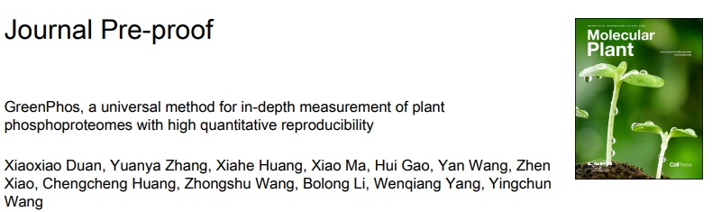 Duan?X,?Zhang?Y,?Huang?X,?Ma?X,?Gao?H,?Wang?Y,?Xiao?Z,?Huang?C,?Wang?Z,?Li?B,?Yang?W,?Wang?Y.?GreenPhos,?a?universal?method?for?in-depth?measurement?of?plant?phosphoproteomes?with?high?quantitative?reproducibility.?Mol?Plant.?2023?Nov?27:S1674-2052(23)00393-3.?doi:?10.1016/j.molp.2023.11.010.?Epub?ahead?of?print.?PMID:?38018035.