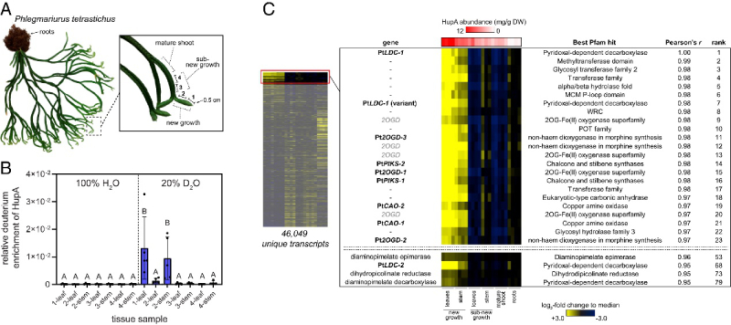 為了指導(dǎo)對(duì)石松生物堿生物合成的研究,作者重點(diǎn)關(guān)注 HupA,因?yàn)樗阎哂凶鳛?AChE 抑制劑的活性和作為藥物的潛力。HupA 由石松屬內(nèi)的物種產(chǎn)生,但這些物種的 HupA 積累水平差異很大。作者推斷物種中 HupA 的增加可能與上調(diào)的生物合成基因表達(dá)有關(guān)。因此,檢測(cè)了石松屬的幾個(gè)物種的 HupA 含量,結(jié)果發(fā)現(xiàn)P. tetrastichus(圖 2A)積累了 HupA 到最高水平。因此,后續(xù)的研究將集中在該物種上。之前的研究表明,從頭 HupA 生物合成對(duì)P. tetrastichus枝條的新生長(zhǎng)具有特異性,接著作者通過(guò)氘同位素標(biāo)記實(shí)驗(yàn)得到驗(yàn)證,并且發(fā)現(xiàn)與莖相比,HupA標(biāo)記在葉中更廣泛分布,表明這里的生物合成基因表達(dá)富集(圖2B)。因此,作者對(duì)對(duì)該物種的多個(gè)組織進(jìn)行了RNA-seq分析,揭示石杉生物堿生物合成基因在活性組織中的積累機(jī)制。