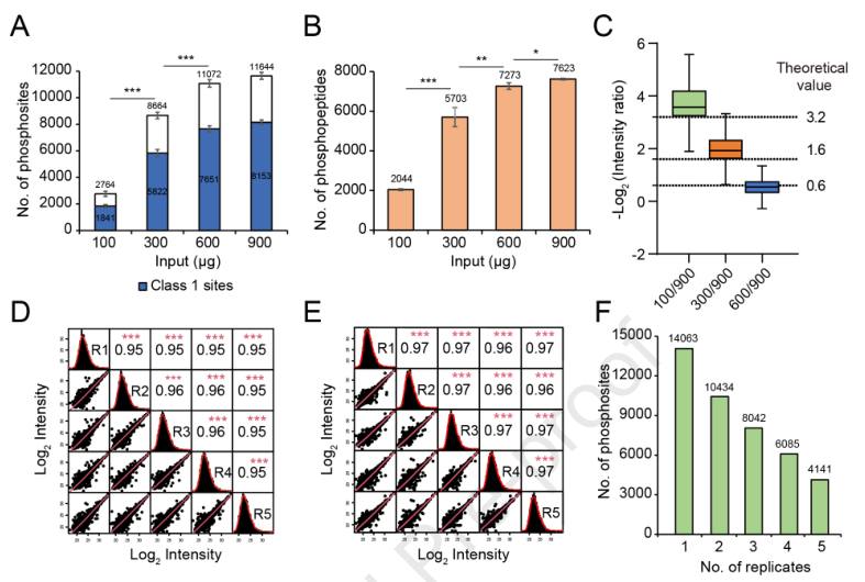 為了評(píng)估GreenPhos在定量磷酸化蛋白質(zhì)組學(xué)中的潛力,作者了鑒定的磷酸化肽與上機(jī)量之間的定量關(guān)系。以900μg為參照,在100、300和600μg中,檢測(cè)到的磷酸肽強(qiáng)度比與參考中磷酸肽強(qiáng)度比的中位數(shù)與理論值具有很好的相關(guān)性(圖3C)。分析結(jié)果表明,GreenPhos與單次LC-MS結(jié)合可用于從高達(dá)600μg的蛋白質(zhì)中定量磷酸肽,準(zhǔn)確度高。通過(guò)5次重復(fù)質(zhì)譜分析,評(píng)價(jià)了GreenPhos在植物磷蛋白組定量鑒定中的再現(xiàn)性。5個(gè)生物重復(fù)和5個(gè)技術(shù)重復(fù)的磷酸肽強(qiáng)度的Pearson相關(guān)系數(shù)平均分別為0.95和0.97 (圖3D和3E),表明具有較高的定量可重復(fù)性。從5個(gè)生物重復(fù)中共鑒定出磷酸化位點(diǎn)14063個(gè),其中74%的磷酸化位點(diǎn)至少在2個(gè)重復(fù)中鑒定出 (圖3F)。結(jié)果表明,GreenPhos可以在定量和定性上產(chǎn)生高度可重復(fù)性的結(jié)果。