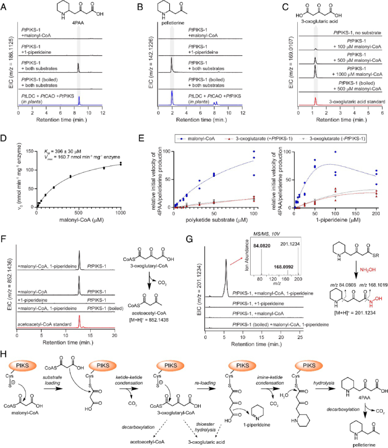 為了更好地了解這種亞胺-酮縮合的機(jī)制,獲得了兩種PtPIKS同源基因的純化蛋白用于體外分析。與我們?cè)诒臼綗煵葜械慕Y(jié)果一致,當(dāng)添加 1-哌啶和丙二酰輔酶 A 作為底物時(shí),PtPIKS-1和PtPIKS-2在體外測(cè)定中都產(chǎn)生了4PAA和pelletierine(圖4 A和B),此外還有其他幾種未知化合物。雖然當(dāng)單獨(dú)孵育 1-哌啶作為底物時(shí)沒(méi)有觀察到明顯的產(chǎn)物,但僅向PtPIKS-1添加丙二酰輔酶 A 會(huì)導(dǎo)致 3-氧代戊二酸的積累(圖 4 C 和 D)。3-氧代戊二酸的積累表明,PIKS能夠催化兩個(gè)丙二酰輔酶A單元縮合成硫酯連接的3-氧代谷氨?;鶊F(tuán),并且該聚酮酸從硫酯鍵上酶促或非酶水解。