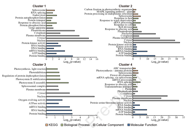 使用Fisher’s-exact對(duì)每個(gè)簇中的磷酸化蛋白進(jìn)行GO和KEGG富集分析(圖5)。與報(bào)道一致,在細(xì)胞組分條目,細(xì)胞核、細(xì)胞質(zhì)和細(xì)胞膜蛋白在所有簇中被顯著富集。在分子功能條目,激酶活性在簇1、2和4中富集,而在簇3中不富集,但是蛋白質(zhì)去磷酸化的在生物過(guò)程條目在簇3中富集。結(jié)果表明,激酶的磷酸化激活和磷酸酶的去磷酸化是鹽脅迫誘導(dǎo)的重要反應(yīng)。