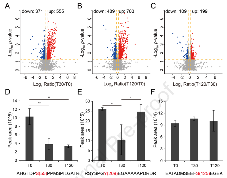 為了深入了解擬南芥對(duì)鹽脅迫響應(yīng)中蛋白磷酸化介導(dǎo)的信號(hào),作者使用GreenPhos和單次LC-MS檢測(cè),分析了100 mM NaCl處理30分鐘(T30)和120分鐘(T120)或未處理(T0)的擬南芥幼苗的磷酸化蛋白質(zhì)組學(xué)(圖4A)。每個(gè)處理包括3個(gè)生物學(xué)重復(fù),每個(gè)重復(fù)600μg蛋白用于磷酸肽的富集??偣矎?316個(gè)磷酸化蛋白中鑒定出12908個(gè)磷酸肽,含有15889個(gè)磷酸化位點(diǎn)。在磷酸肽中,13473個(gè)磷酸位點(diǎn)在處理的至少一個(gè)重復(fù)中包含可量化的信息。