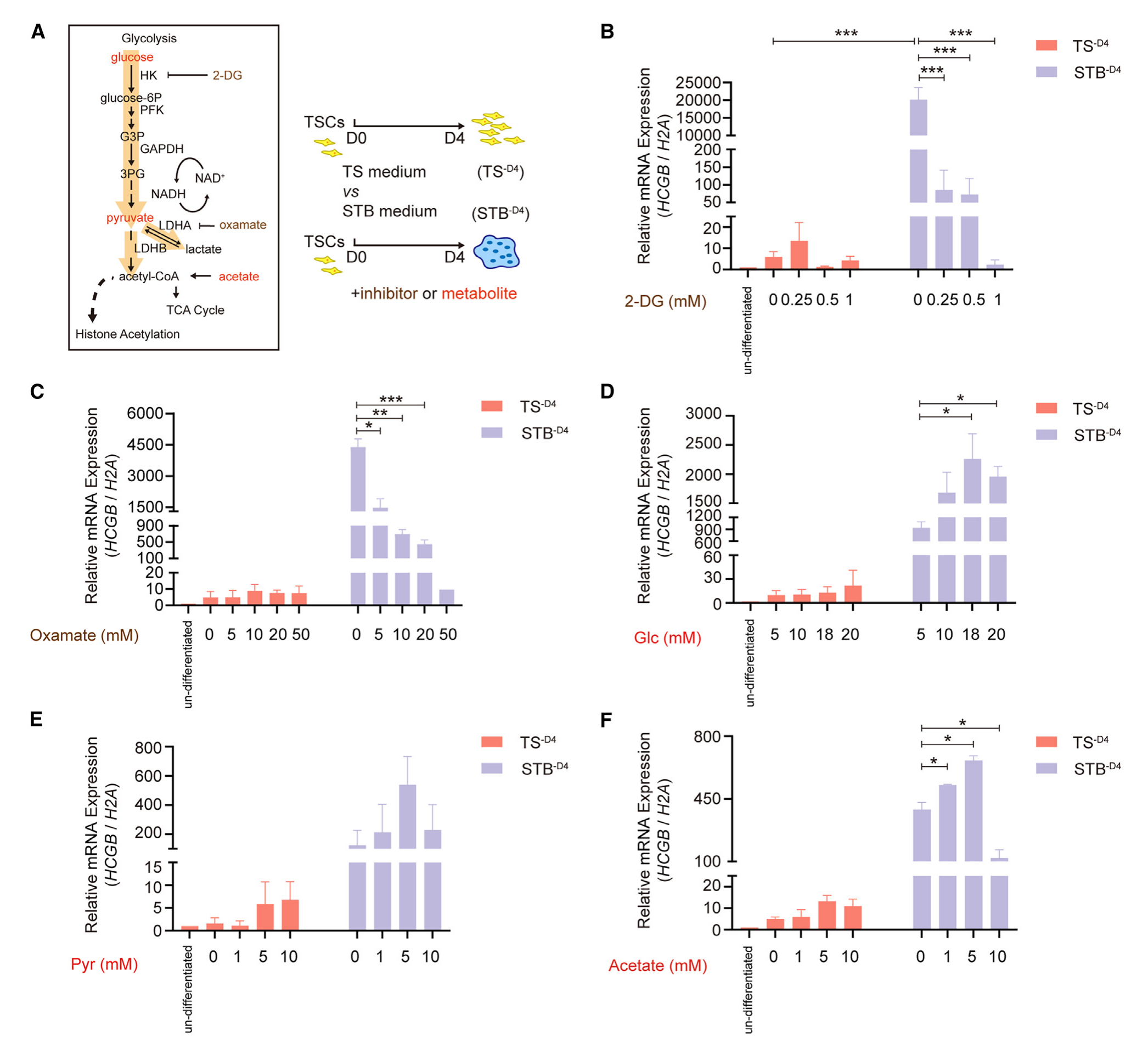 接下來(lái),該研究使用糖酵解的關(guān)鍵代謝物,包括葡萄糖、丙酮酸和醋酸酯(用于補(bǔ)充細(xì)胞內(nèi)乙酰輔酶A),來(lái)探索糖酵解代謝物對(duì)人滋養(yǎng)細(xì)胞合胞的影響。結(jié)果表明,隨著葡萄糖濃度的增加,從5到18 mM,STB-D4細(xì)胞中HCGB以及SDC1、ERVFRD1、ERVW1、GCM1、PSG4和CYP19A1的表達(dá)逐漸增強(qiáng),滋養(yǎng)細(xì)胞的合胞化程度逐漸增強(qiáng)(圖3D)。丙酮酸處理在未分化的hTSCs和正在合胞的hTSCs中導(dǎo)致了類似的反應(yīng),即一定濃度范圍內(nèi)(10 mM)的代謝物增加了滋養(yǎng)細(xì)胞的合胞 (圖3E)。同樣,在一定濃度范圍內(nèi),乙酸也顯著促進(jìn)滋養(yǎng)細(xì)胞合胞(圖3F),在超高濃度下,HCGB、GCM1、PSG4和CYP19A1被顯著抑制(圖3)。特別指出,糖酵解藥物和中間體對(duì)HTSCs和STBs的合胞有特異性作用,但對(duì)未分化的htsc沒(méi)有特異性作用。因此,涉及STB特異性信號(hào)傳導(dǎo),并且調(diào)節(jié)滋養(yǎng)層合胞化可能需要較佳水平的基礎(chǔ)糖酵解物質(zhì)。