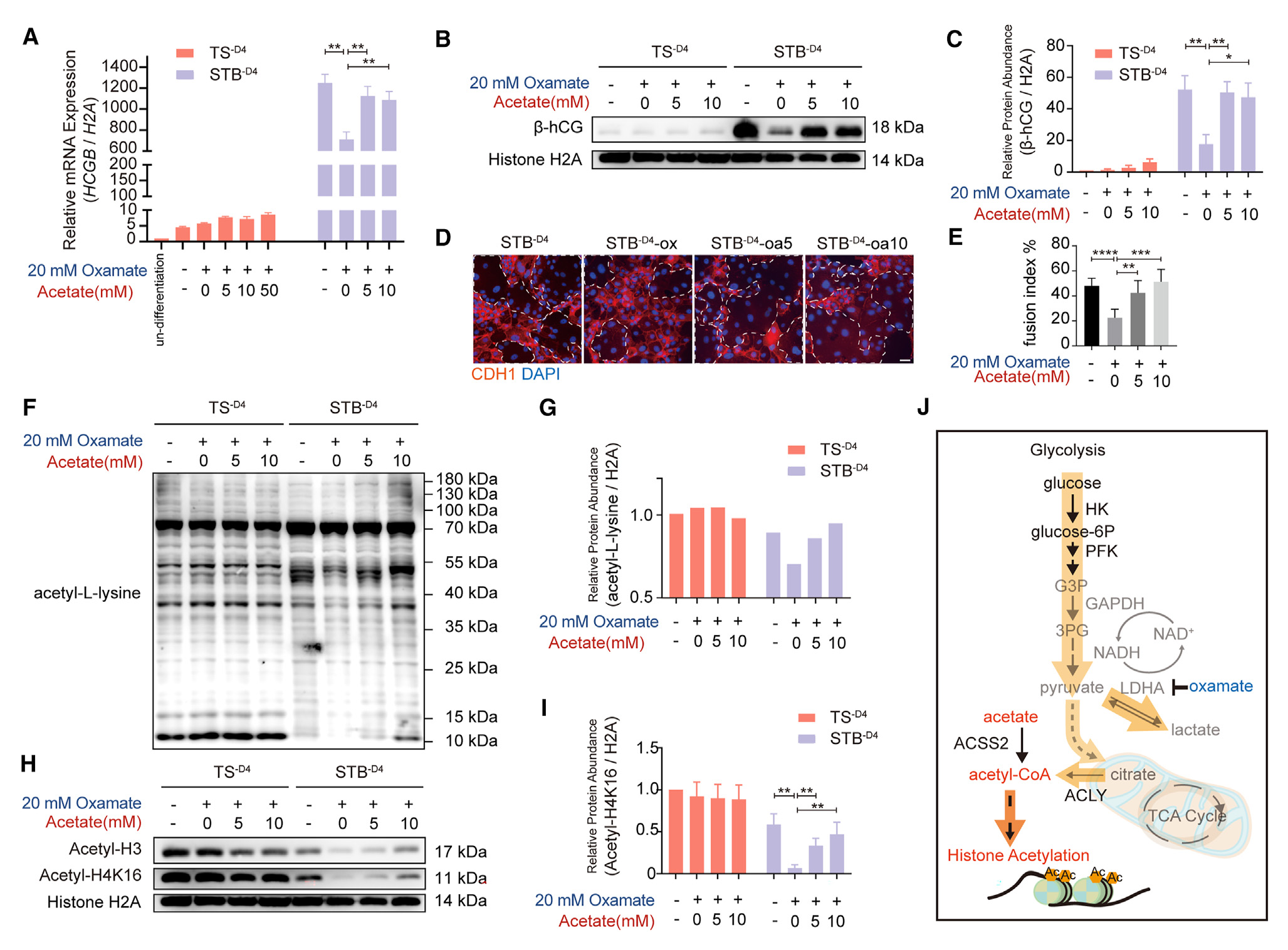 為了進(jìn)一步表征乙酸如何在滋養(yǎng)細(xì)胞合胞過(guò)程中恢復(fù)糖酵解抑制的作用,作者對(duì)經(jīng)草酸和乙酸處理的TS-D4和STB-D4細(xì)胞進(jìn)行了RNA測(cè)序(N = 8個(gè)樣本)。相關(guān)熱圖分析和主成分分析顯示,經(jīng)草酸和乙酸處理的未分化hTSCs的基因表達(dá)變化無(wú)明顯變化(圖5A)。然而,對(duì)于正常的STB-D4 (STB_c),草酸處理(STB_ox)導(dǎo)致轉(zhuǎn)錄組發(fā)生劇烈變化,而5和10 mM乙酸處理(STB_oa5, STB_oa10)逐漸使轉(zhuǎn)錄組恢復(fù)正常(圖5A)?;蚣患治?GSEA)進(jìn)一步證實(shí)未分化的hTSCs被富集用于糖酵解,而分化的STBs則被富集用于類固醇激素基因(圖5B)。這些轉(zhuǎn)錄組結(jié)果再次強(qiáng)調(diào)了未分化的hTSCs對(duì)草酸或乙酸鹽不敏感,而分化的STBs對(duì)草酸抑制和乙酸鹽拯救高度敏感。