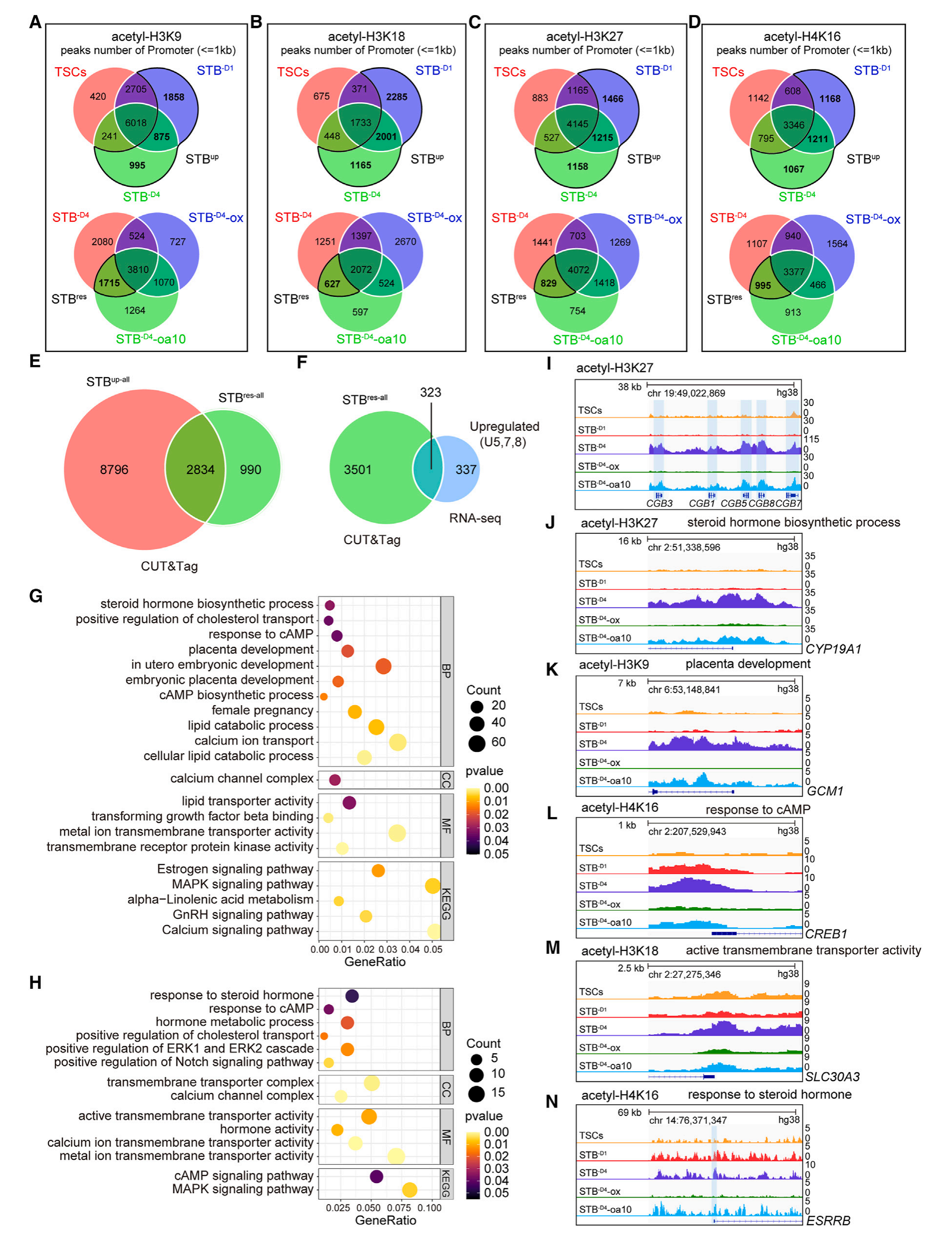 為了探究被乙酸拯救的組蛋白乙?;欠褚矊?dǎo)致轉(zhuǎn)錄拯救,該研究比較了來(lái)自CUT&Tag的STBres-all集與來(lái)自RNA-seq的拯救基因集(包括U5、U7和U8,共660個(gè)基因)。分析結(jié)果顯示,這兩個(gè)基因集共有323個(gè)基因(圖6F),即表觀遺傳和轉(zhuǎn)錄獲救。對(duì)這些表觀遺傳和轉(zhuǎn)錄獲救的基因進(jìn)行GO和KEGG通路分析的結(jié)果與RNA-seq分析的結(jié)果相似,在cAMP和MAPK信號(hào)、激素合成/分泌以及其他合胞途徑中的跨膜物質(zhì)運(yùn)輸中都有顯著的富集(圖6H、6M、6N)。