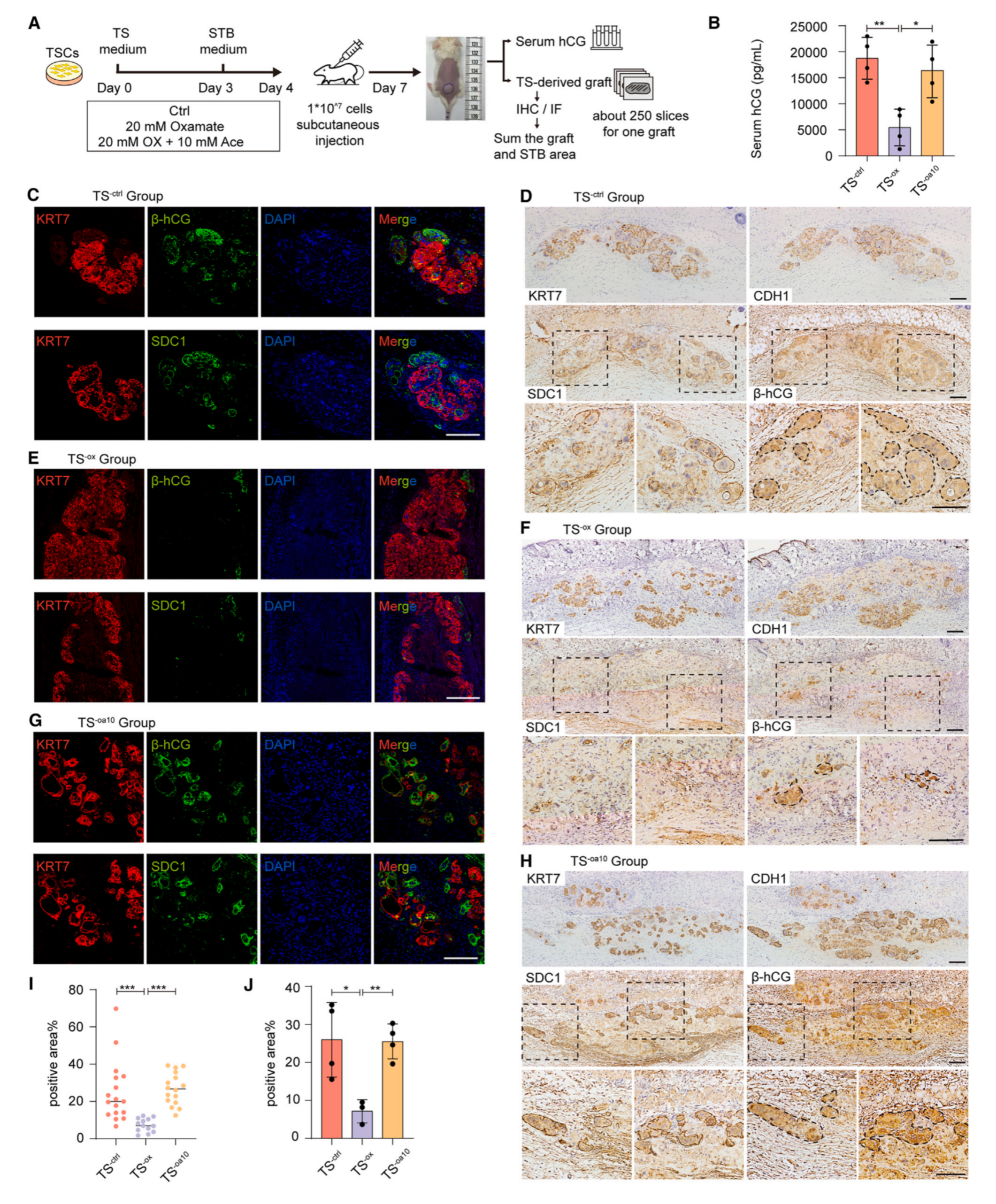 小鼠皮下注射對(duì)照hTSCs (TS-ctrl)、氨基甲酸酯處理hTSCs (TS-ox)和氨基甲酸酯和醋酸酯短暫處理hTSCs (TS-oa10)。隨意喂養(yǎng)NOD-SCID小鼠生長(zhǎng)7天后,檢測(cè)血清hCG,并對(duì)移植的滋養(yǎng)細(xì)胞進(jìn)行免疫熒光和免疫組織化學(xué)染色,以確定體內(nèi)滋養(yǎng)細(xì)胞的合胞程度(圖7A)。然而,結(jié)果顯示STBs分泌到TS-ox小鼠血清中的hCG明顯低于TS – control小鼠(圖7B)。這與靶向數(shù)據(jù)一致,顯示在STB分化的第1天,乙酰輔酶A已經(jīng)開始上升,轉(zhuǎn)錄和表觀基因組數(shù)據(jù)顯示,STB分化的許多標(biāo)記已經(jīng)在第1天開始上升。因此,滋養(yǎng)層細(xì)胞在分化24小時(shí)內(nèi)就已經(jīng)進(jìn)入了STB的命運(yùn),在滋養(yǎng)層分化的這個(gè)時(shí)間點(diǎn)干擾糖酵解代謝可能對(duì)細(xì)胞命運(yùn)產(chǎn)生不可逆的影響,但不影響細(xì)胞活力。