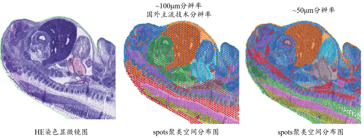 百創(chuàng)S1000分辨率最高可達到4.8μm,相比目前主流空間轉(zhuǎn)錄組測序芯片精度提高了近400倍,高分辨率下HE染色組織形態(tài)學(xué)與spots聚類空間分布圖重合度更高,可以更加精準識別空間基因表達的異質(zhì)性和組織區(qū)域的特異性。